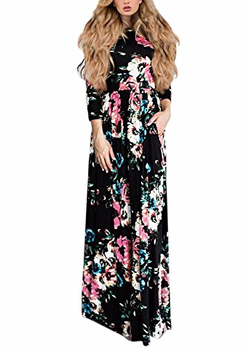Women's Elegant Floral Long Sleeve Summer Beach Long Maxi Dresses Black S