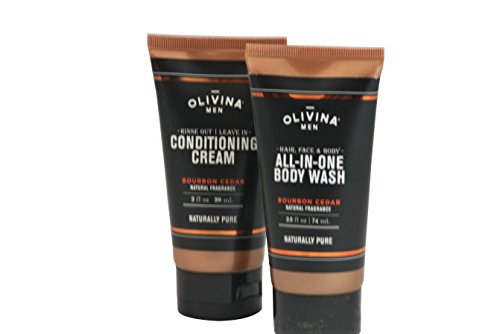 -. Feature : Get your Olivina Men fix on the go with this travel size duo. / Pare down your regimen with this All-in-One Body Wash that refreshes your face, body, and hair with just one effective formula. This balanced cleanser removes dirt and grime without leaving you dry or oily. / .The dual-purpose Conditioning Cream helps strengthen hair, promote healthy growth, and boost natural shine with a nourishing blend of organic olive oil, elderberry, and barley protein. With two methods of application, this conditioning cream works in any schedule. Rinse out: to soften and restore hair, apply after washing. Leave in: to add control and natural shine. / Both the Body Wash and Conditioning Cream are lightly scented with warm red cedar and smoky vanilla for what will become your favorite fragrance - Bourbon Cedar. / 2.5 ounces each