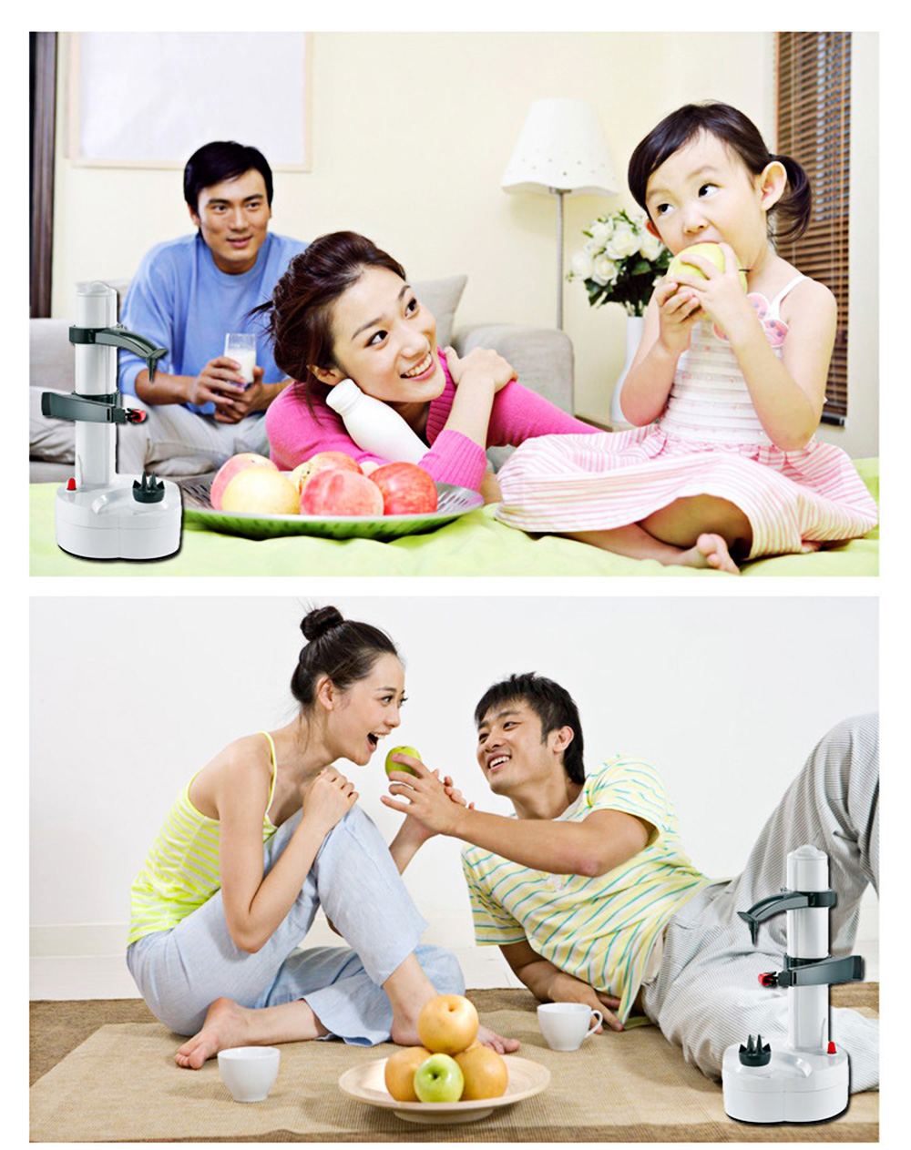 The product is the amazing peeling machine that peels away potato, vegetables and fruit skins in seconds, in one fast easy motion! It takes the fast and efficient traditional design of your favorite kitchen tool and speeds it up. The indispensable kitchen tool! Peels potatoes, fruits and vegetables instantly, at the push of a button!