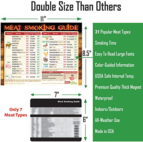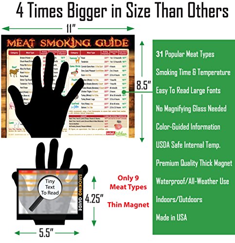 - MUST-HAVE BBQ TOOL: This Meat Smoking Guide is the only magnet that provides 31 meat types (3 times more than others) with important smoking time and temperature chart to help you cook to perfection. Unlike other small magnets with tiny text, this magnet provides you easy to read big text with a compilation of time-tested smoking approximate time, smoking temperature, target internal temperature and USDA minimum internal temperature.
