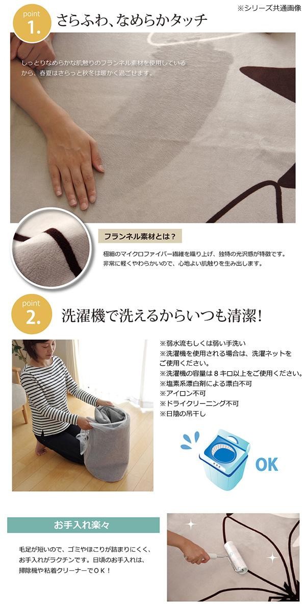 | さらっとしてて、やわらかいフランネル生地を使用したラグです。春夏はラグとして、冬場はホットカーペットカバーとして、オールシーズンご使用いただけます。 |