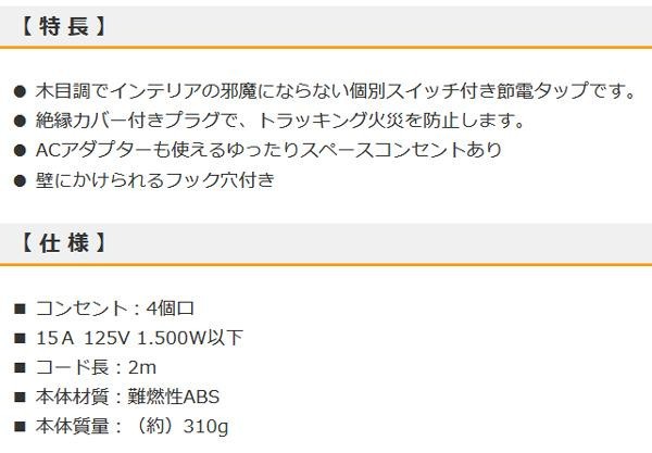 ACアダプターも使えるゆったりスペースコンセントあり。壁にかけられるフック穴付きです。 生産国:中国 ※サプライヤー直送品 ご注文後3~4営業日後の出荷となります【商品名】OHM 電源タップ 個別スイッチ付き 木目調 4個口 2m HS-TP42A43WO