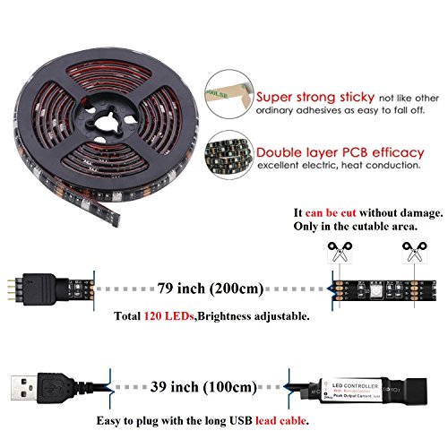 - 1. [ USB Upgrade ] - This 79 inches/200 cm 120 LED strip with upgrade DC 5V USB port and 3M adhesive,just plug and play,the 3.3 feet lead cable is very convenient and safe.