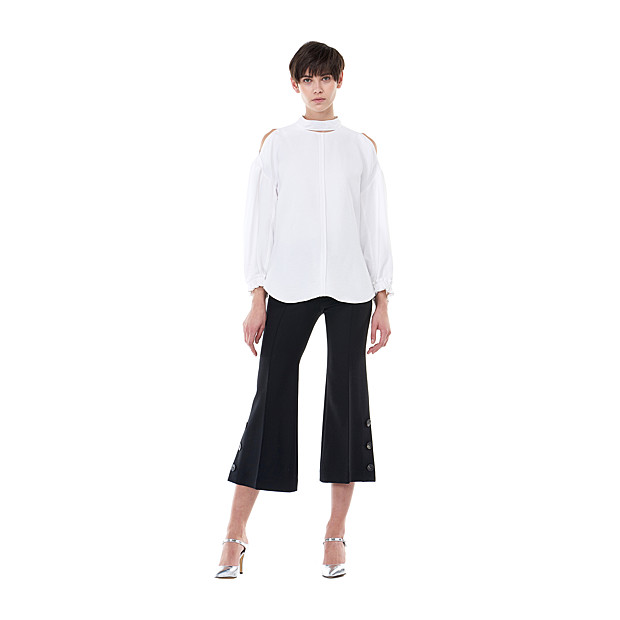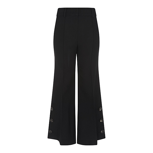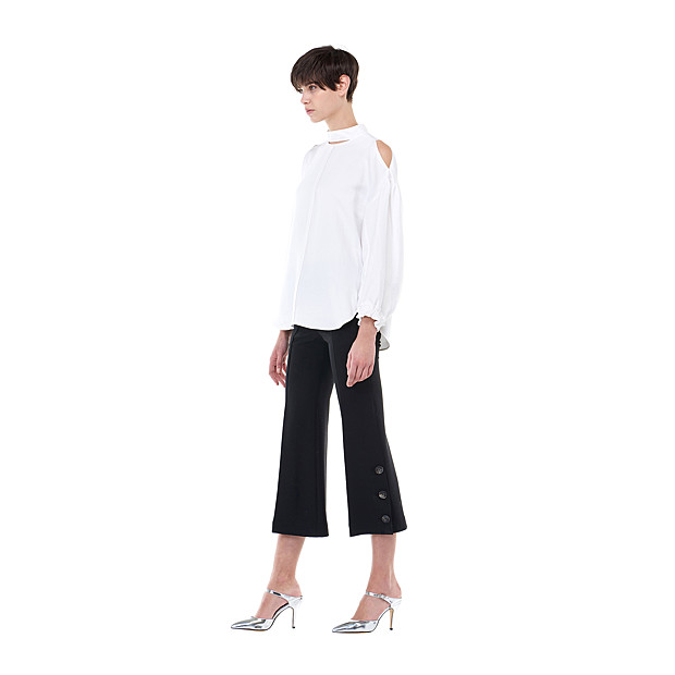 옆쪽에 버튼 포인트가 있는 부츠컷 팬츠입니다. 밑단이 와이드한 느낌으로 캐주얼 코디와 정장 코디에도 유용한 상품입니다.