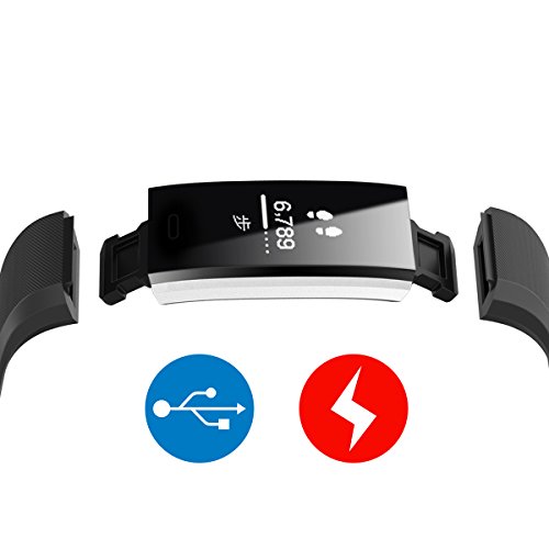 -. Feature : Sports Fitness Tracker ▲heart rate monitoring, pedometer, calories record, sleep quality monitoring, sync date and time, notifications, remote camera control, anti-lost alert, find Phone, sedentary alert, etc. / Sizet Fitness Tracker - Multi-Sport Mode ▲ 8 default sport modes on the fitness tracker and 6 sport modes can be added in the APP, 14 kinds of sport modes in total, rack workout, running, riding, treadmill, hiking, fitness, basketball, badminton, tennis, football, climbing, spinning, yoga, dancing. / Connect to your phone with bluetooth4.0, compatible with Android 4.4 or higher, IOS 7.0 or higher. / Share your life:you can synchronize the data to Google Fit. You can also share your data on Twitter, Facebook, and a lot of other social platforms. The app can also display charts to show the week, month and year activity data. We will upgrade our app version to make you enjoy better service from time to time. / lease charge it on USB plug, charge time: 1-2 hours. We recommend charging your device every few days to ensure you are always tracking.