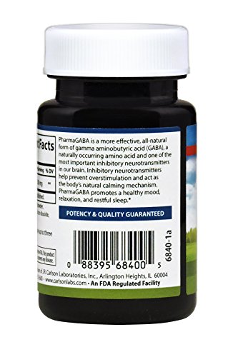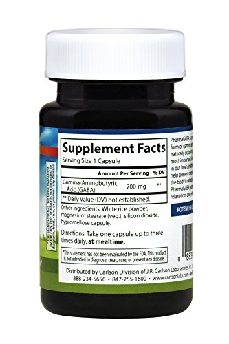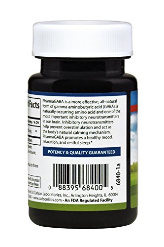 ReleaseDate : 2016-12-27 Studio : Carlson Labs Publisher : Carlson Labs Binding : Health and Beauty Product Description Carlson Labs' Pharma GABA is a unique and powerful supplement that uses all-natural GABA to promote a healthy mood and provide relaxation when needed. It also supports a restful sleep pattern, and its freshness and potency is guaranteed. 0