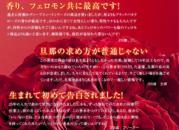 成分 エタノール、香料(ブラックバカラローズ・ヒトフェロモン)、イランイラン油