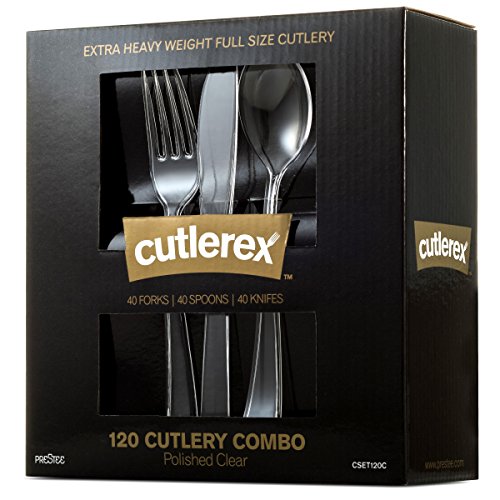 CUTLEREX Heavy Duty Plastic Silverware Cutlery – Crystal Clear – Disposable Flatware Set 40 Forks 40 Spoons and 40 Knives Combo 120 Bulk Pack Essential Party Supplies