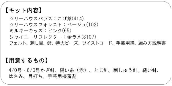 | 素材・材質 | ツリーハウスパラス:ウール100% ツリーハウスフォレスト:ウール70%・アルパカ30% ミルキーキッズ:ウール60%・アクリル40% シャイニーリフレクター:キュプラ63%、ポリエステル37% フェルト:ポリエステル100% 刺し目:ユリア樹脂100% 鈴:真鍮100% ビーズ:ガラス100% ツイストコード:レーヨン100% 手芸用綿:ポリエステル100% |