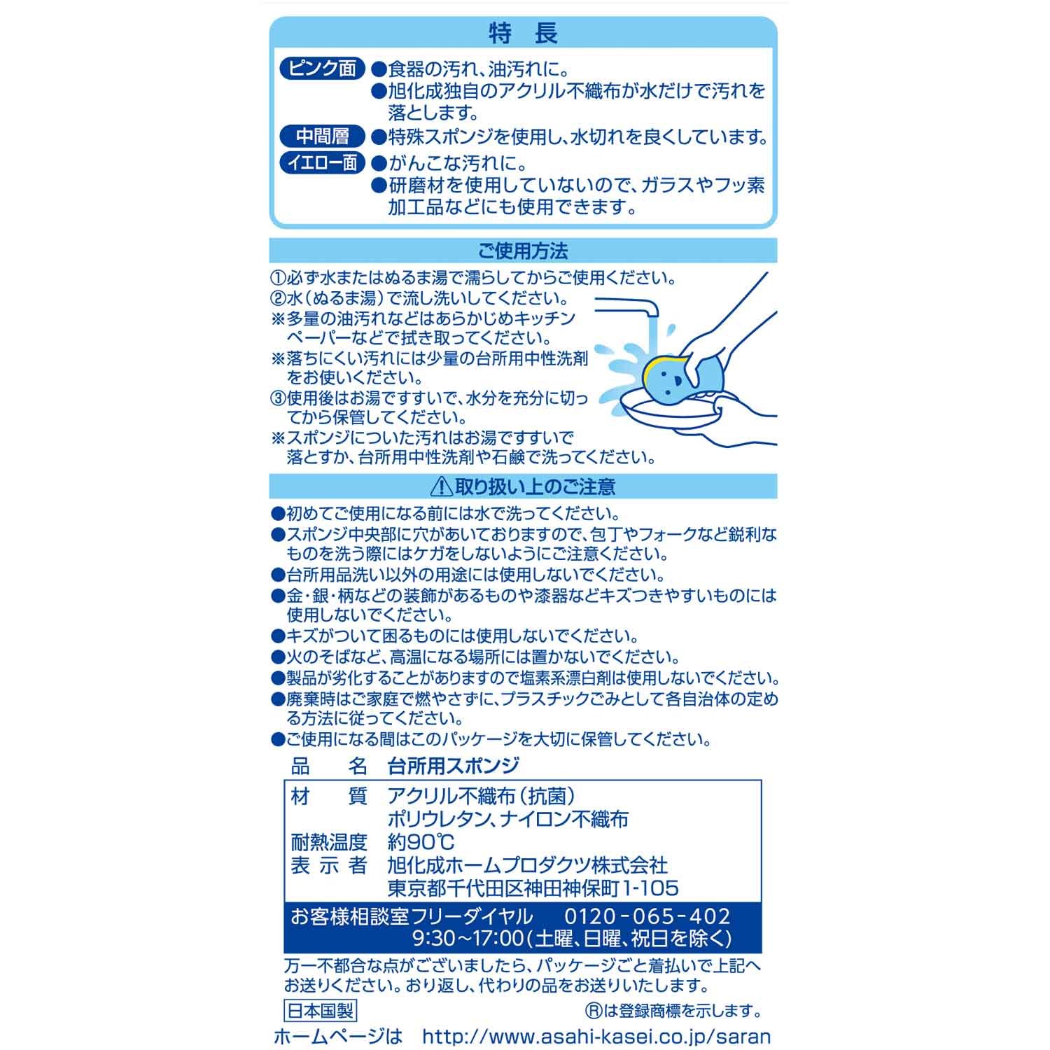 ● Since the hole is opened in the center of the sponge, please be careful not to injured when washing sharp items such as knives and forks.