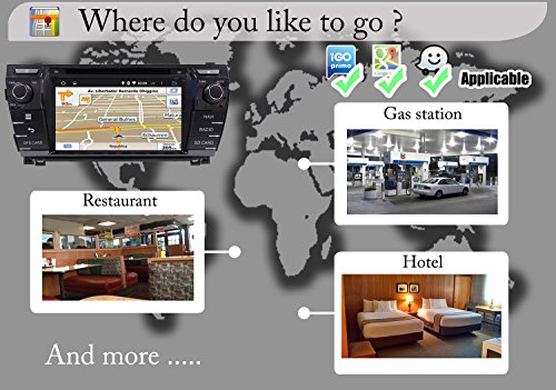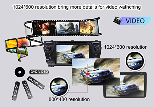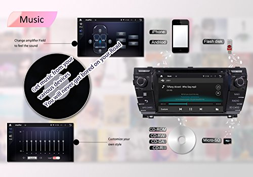 - Feature : 1. SYSTEM & SCREEN: Double din car stereo with pure Android Kitkat 4.4.4, easy to pickup; Loaded with Samsung DDR3 1GB RAM & Rockchip 3066 1.6GHz Cortex A9 Dual-core CPU and 8GB flash memory for a smoother running of 2D/3D map or video; Adopts capacitive digital 1024*600 HD screen, multi-touch, 175 viewing angle, day and night readable / 2. MULTIMEDIA: Support Mirror Link--iphone Airplay and android phone Easy-connect; 30 stations of analog AM/FM RDS radio; Play music or video via SD card or USB drive; Support Dual Zone function to watch DVD-video on headrest monitor when navigating; Support 1080P video; Loaded with Hitachi pickup and Toshiba amplifier for an advanced car audio quality, support subwoofer & EQ / 3. MULTI-FUNCTION AND INTERNET: Support Steeing Wheel Control; Built-in GPS navigation, FREE MAP & 8GB MAP CARD PRESET; Bulit-in Bluetooth for hands-free calling and phone music playing; Support OBD2 real-time diagnosis, DVR, AV-IN; Built-in WiFi and 3G and WiFi hotspot, surfing the internet, downloading android apps, sending email and reading business file(pdf/word) are all available / 4. THE IN DASH VEHICLE GPS UNIT FITS TO Toyota Corolla 2014 with out JBL sound system, if your car has JBL, then please buy a Can Bus Decoder / 5. Doorstep delivered within 3-7 business days by FREE DHL AIR EXPRESS rather than one month suggested by amazon. 12 months warranty for quality issues.
