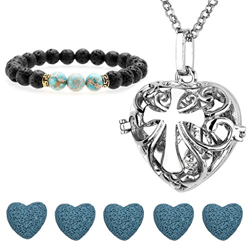 Top Plaza Aromatherapy Essential Oil Diffuser Necklace Silver Heart Cross Locket Pendant With 5 Dyed Lava Rock & Lava Stone Elastic Bracelet(Blue)