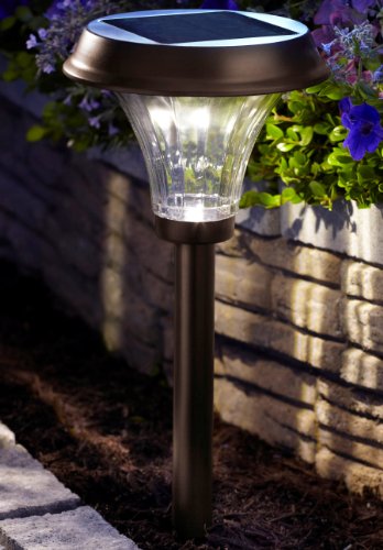 - STYLISH GARDEN PATH SOLAR LIGHTS: with an elegant ribbed bronze finish and a big glass lens in ribbed design for optimal light output, this LED solar path light is a priceless fixture for illuminating a dark path or lane