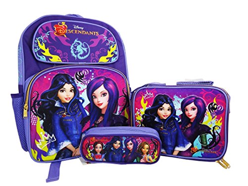 -. Feature : Disney Descendants Backpack, Lunch bag, and Pencil Pouch combo set / Insulated Lunch Bag with Adjustable shoulder strap. Both have Double zippered main compartment. / Backpack has Two Front pockets with zipper closure, Adjustable shoulder straps, and side mesh pockets. / Lunch Bag Dimensions approximately : 10"H x 8"W x 4"D / Back Pack Measures approximately : 16"H x 12"W x 5"D