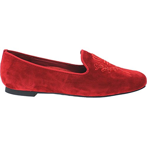 -. Feature : Upper: black, dark grey or red suede with matching embroidery (Coming in July: black and navy velvet with gold embroidery) / Footbed: removable microfiber-wrapped EVA / Outsole: durable rubber / Approximately 1/2" heel