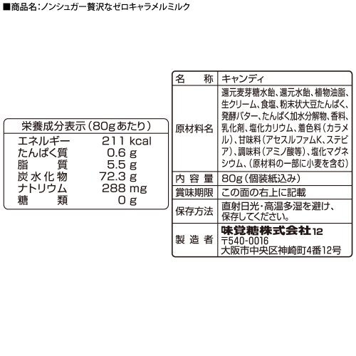 原材料:還元麦芽糖水飴、還元水飴、植物油脂、生クリーム、食塩、粉末状大豆たんぱく、発酵バター、たんぱく加水分解物、乳化剤、香料、酸味料、塩化カリウム、着色料(カラメル)、甘味料(アセスルファムK、ステビア)、調味料(アミノ酸等)、塩化マグネシウム、(原材料の一部に小麦を含む)