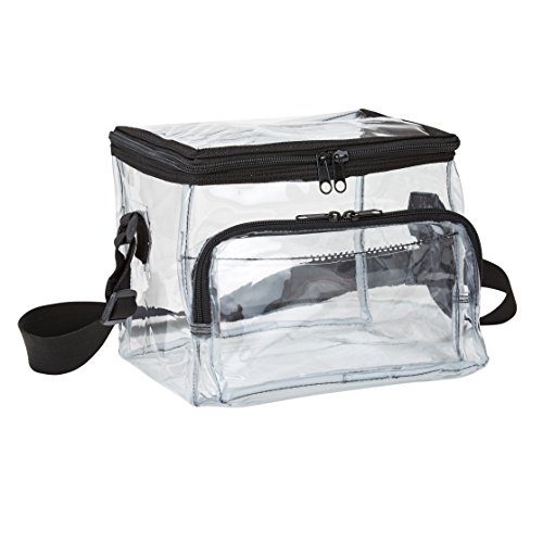 Our clear lunch bag is sturdy and functional. Front zipper pouch, adjustable shoulder strap. Dimensions: 8"W x 6.5"H x 5.5"D This clear bag is perfect for workplaces that require clear handbags or clear purses. Perfect for correctional officers, retail employees, etc. 60 day warranty against manufacturer defects, including zipper breakage.Feature