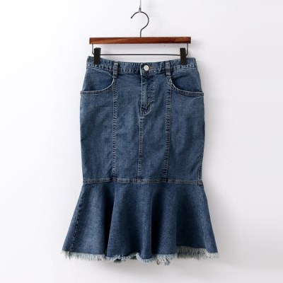 플레어 라인이 돋보이는 데님 머메이드 스커트.