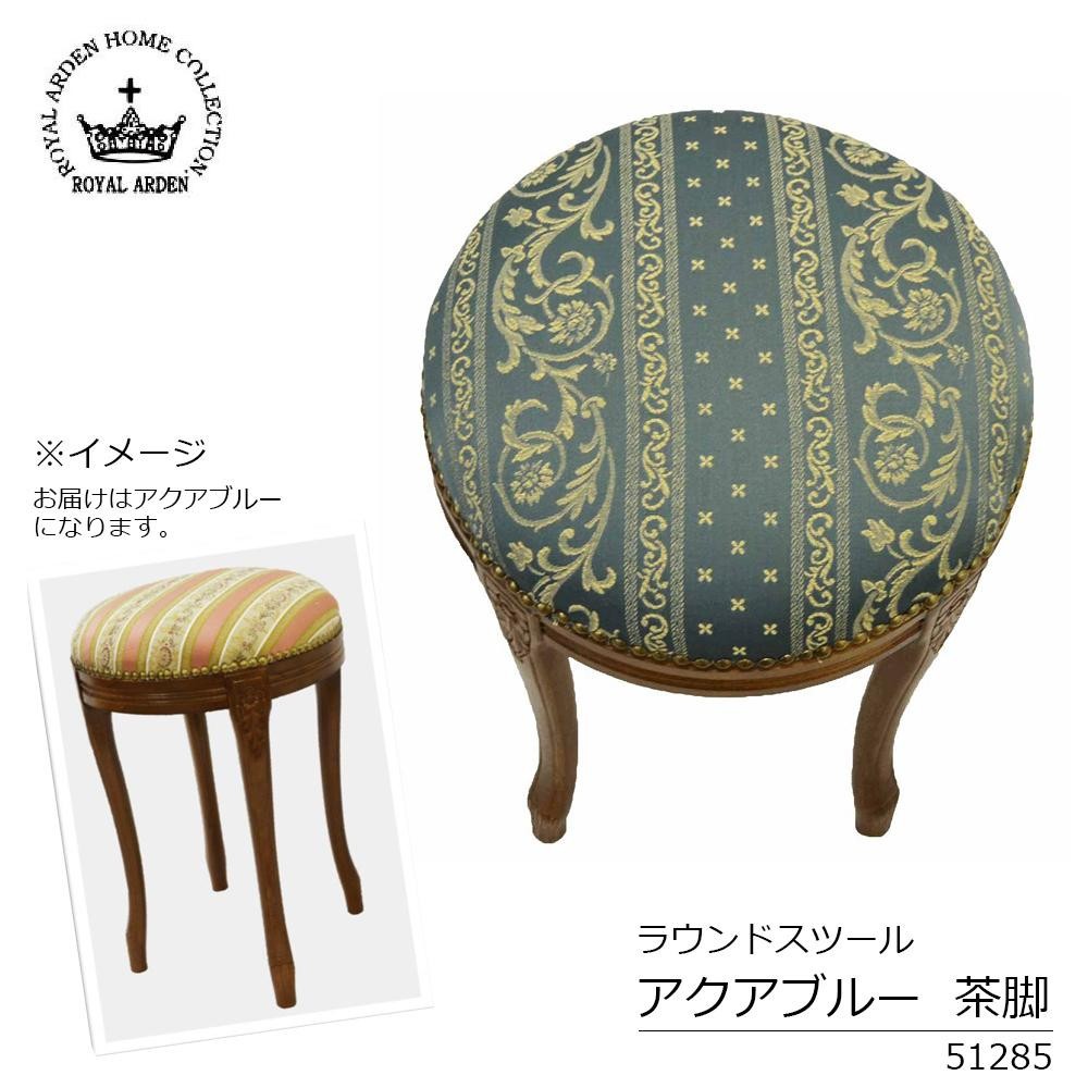 アンティーク調のおしゃれなスツールです。エレガントなお部屋にぴったり。 製造国:イタリア 素材・材質:脚:天然木ビーチ材ファブリック:ポリエステル51%、綿49% ※サプライヤー直送品 ご注文後5~6営業日後の出荷となります【商品名】ロイヤルアーデン イタリアスツール ラウンドスツール アクアブルー 茶脚 51285