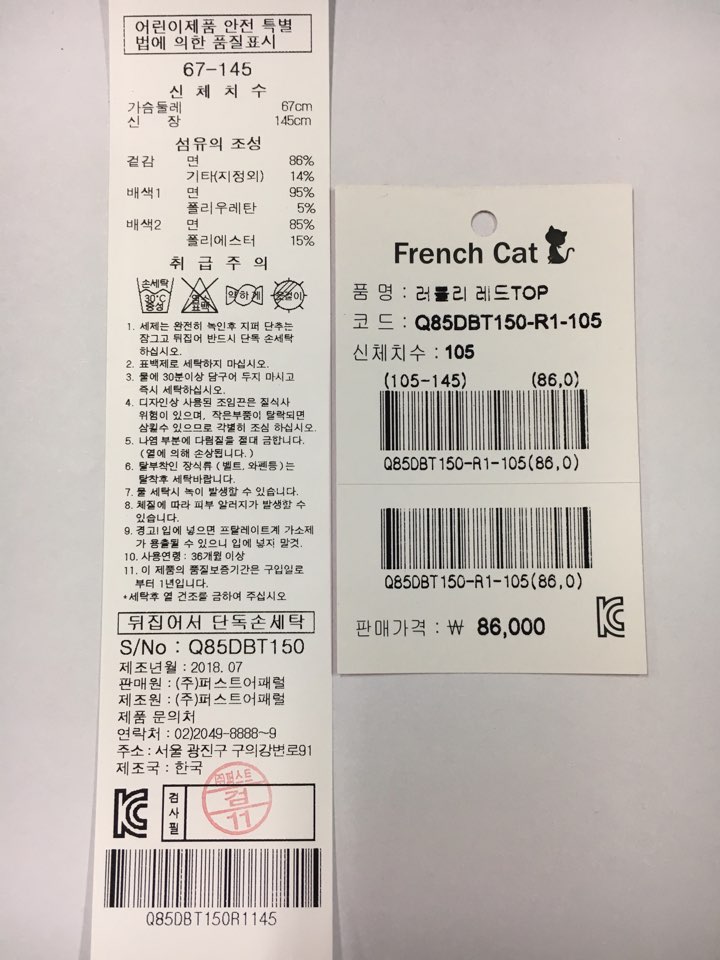 제품소재 : 겉감:면86% 기타(지정외)14%배색1:면95% 폴리우레탄:5%배색2:면85% 폴리에스터15%