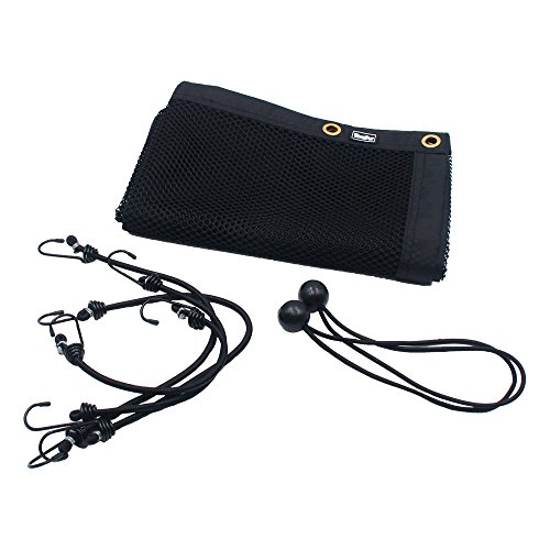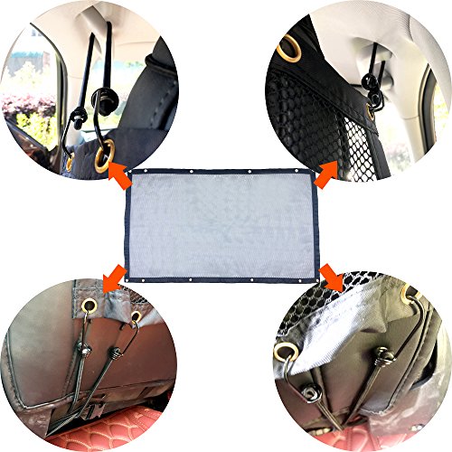 -. Feature : Demension:50"(W)*29.5"(L).Include a high quality mesh net and come with the bungee cords.1 FREE seat belt as a gift for you. / Durable and long lasting, strong hook in bungee cords is not easily deformed, protective cover designed won't hurt the dogs / Long and high than normal, multiple holes for adjusting the configuration, fits most cars, , trunks or SUV. / No need to worry about dog jumping to your seat and putting you at risk of a wreck or anything while driving. / Easy to store or set up in car, little bungies that will hold net in place, no damage to the car interior.