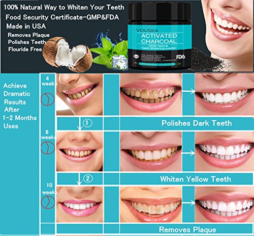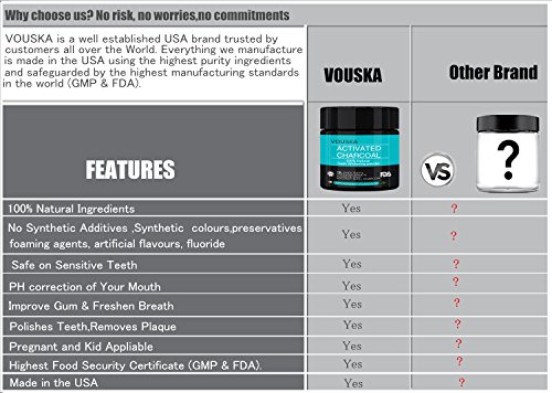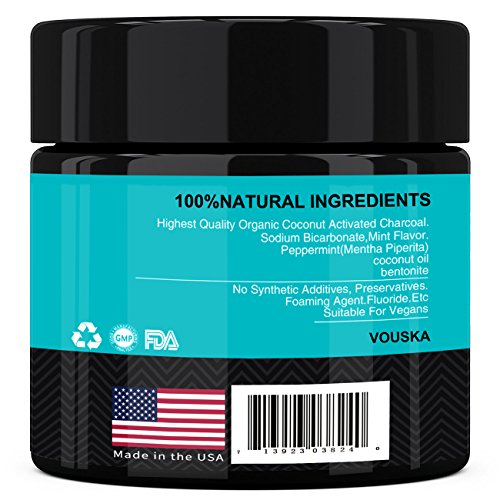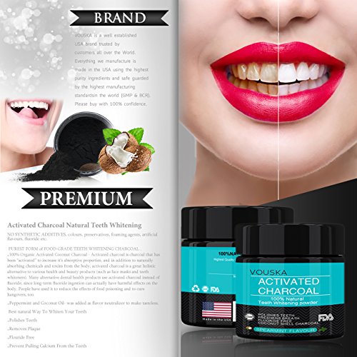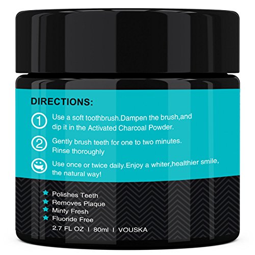WHY CHOOSE US? If you are looking for the most safe and natural teeth whitening products from trustable company,Vouska's activated charcoal teeth whitening is here,all Vouska's products are rigorously studied for purity, safety and efficacy.Once you experience our charcoal teeth whitening, you'll never go back to store-bought brands or unpleasant dentist visits. HOW DOES VOUSKA'S ACTIVATED CHARCOAL TEETH WHITENING WORKS? Due to the finest of the activated coconut charcoal powder, it's extremely effective at binding to toxins.When it comes to teeth,It pulls toxins from the mouth and removes stains. It's able to absorb large amounts of plaque - leaving your teeth clean and detoxified. The charcoal powder also picks up and absorbs calcium salts, without affecting your natural coating, meaning it does not cause any damage or sensitivity.? NEW BREAKTHROUGH UNIQUE OPTIMIZED FORMULATION ●Totally used as a daily toothpaste replacement(unlike others need to use together with toothpaste) ●Safely and effectively polishes and whiten teeth? ●Safe for caps, crowns and veneers ●Helps remove plaque,coffee, tea, and red wine stain,etc.Remove bad breath ●100% Vegetarian and cruelty-free ●Ultra fine activated charcoal powder-No gritty and nasty taste? ●fluoride-free, nonabrasive formula? ●100% safe and effective to remove plaque ,coffee, tea, and red wine,etc ●FDA CERTIFIED -Use FDA approved material,RDA TESTED proven to not damage teeth enamel,DDS TESTED AND APPROVED( Gentle for Sensitive Gums) ●Ultra fine powder-No gritty and nasty taste .?Mint oil added to freshen breath INGREDIENTS:Organic Coconut Activated Charcoal, Bentonite,? Coconut and Mint Oil . 0 |