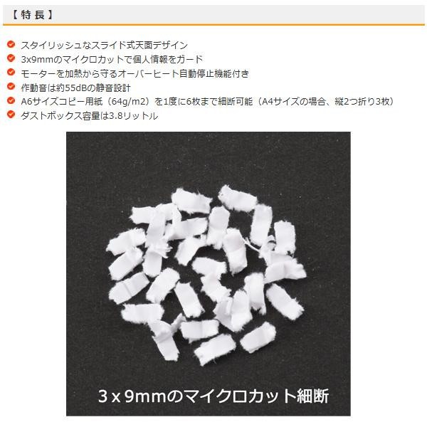 | 仕様 | ■電源:AC100V 50/60Hz ■消費電力:180W ■定格電流:1.9A ■定格時間:3分、休止時間:45分 ■投入口幅:115mm ■細断サイズ:3×9mmマイクロカット ■最大細断枚数:A6コピー紙(64g/m2)6枚※A4用紙の場合:縦2つ折りで3枚 ■細断速度:約2.5m/分 ■コード長さ:約1.2m ■ダストボックス容量:約3.8リットル(A4用紙66枚相当) ■作動音:55dB |