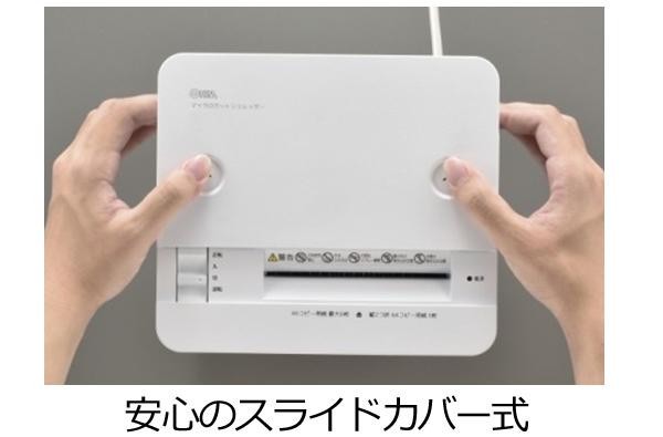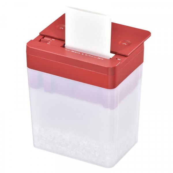 場所を選ばないコンパクトなシュレッダーです。55dBと静かな作動音です。安心のスライドカバー式なので、使わない時は閉じておけます。一度に裁断できる枚数は最大A6用紙6枚です。連続使用時間は3分です。紙くずのたまり具合を確認しやすい半透明のダストボックスです。 |