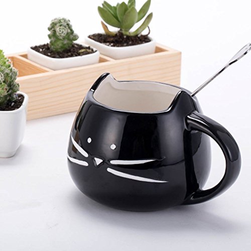 12 oz, glossy black, cute cat pattern, gift package, spoon is not included