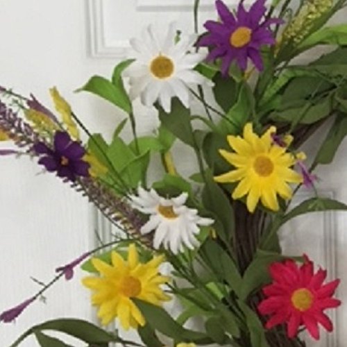 - DECORATIVE WREATH - This bright artificial flower wreath contains a mixture of multicolored assorted flowers in yellow, pink, white and purple flowers and wispy assorted greens all nestled on a 13.5 inch grapevine wreath base