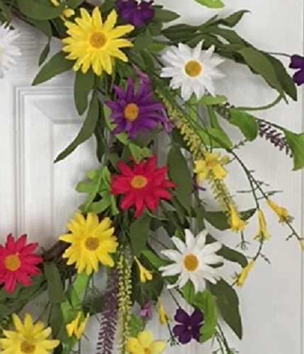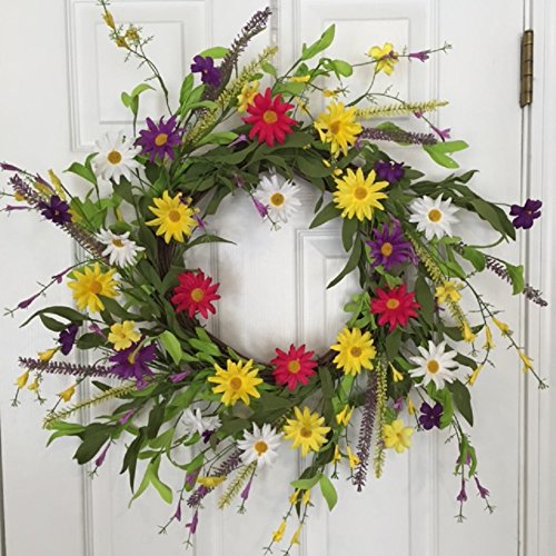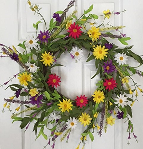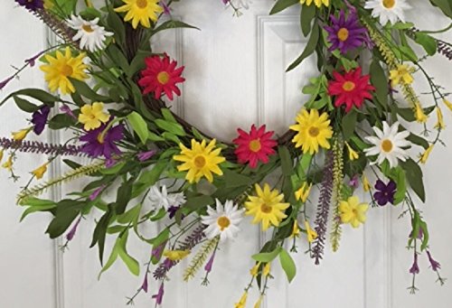 - KEEP SMILING CHEERFUL DAISY WREATH - 20 - 22 Inches - Handmade Decorative Wreath With Yellow, Pink, Purple And White Daisies . This colorful wreath will look vibrant when used a front door wreath on a protected door or in an entryway or bedroom.
