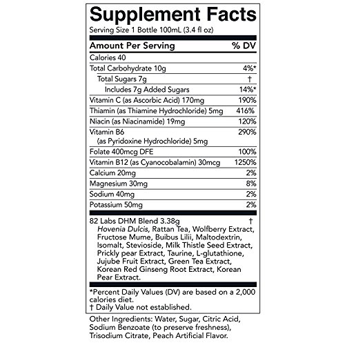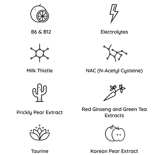 Proprietary blend of electrolytes, Vitamin B complex, Vitamin C, milk thistle, prickly pear extract, Korean pear extract, green tea extract, red ginseng and more.