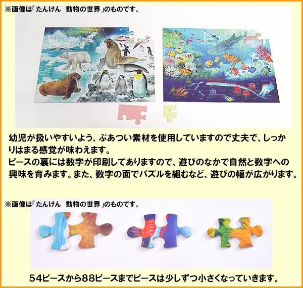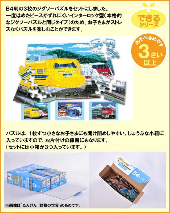 | 遊びながら学習につながる集中力と作業力を伸ばす、「スモールステップ」方式のジグソーパズルのセット。このSTEP4は、54ピースのパズルから、88ピースのパズルまで、合計3枚のジグソーパズルがセットされています。少しずつピースを増やしていくことで、パズルを完成させる達成感を味わいながら、集中力と作業力を高めていけます。 |