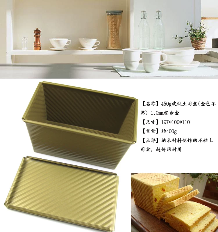 产品说明:制做土司的基本工具。金色不沾涂层内部采用三层P.T.F.E不沾处理,使用寿命比一般两层不沾涂层延长1/3,具有良好的不沾效果和卫生无毒特性,更能提高工作效率和增加产品的美观和卫生。