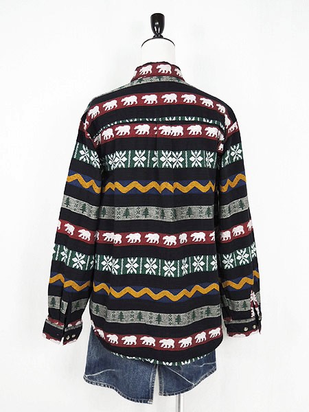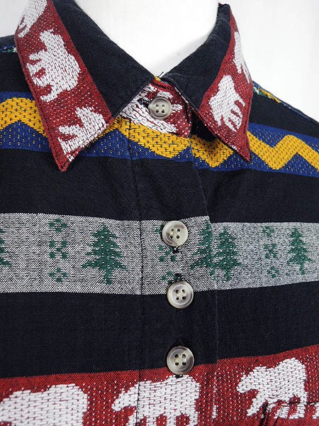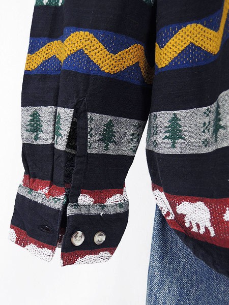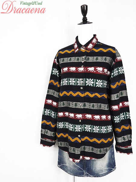 Ladies ブランド- カラー黒ベース・カラフル メール便不可 コンディション★★★ 素材コットン 表記サイズL スタッフコメントクマ、雪の結晶、木などが刺しゅうされているカラフルなネイティブボーダー柄のシャツ。コットン素材なので1年中活躍する1枚です。 実寸サイズ 着丈 71.5 cm 身幅 52 cm 肩幅 46.5 cm 袖丈 57.5 cm ※ウエスト・ヒップ以外は平置き採寸