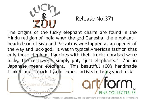 -. Binding : Misc. -. Brand : Objet d' Art -. EAN : 0845277003480 -. Feature : Made 100% by hand by expert metal handicrafters. / Beautifully boxed and includes certificate of authenticity, presentation gift card with matching envelope. / A beautiful, tasteful collectible. A gift worth giving and keeping for a lifetime. / Hand applied authentic Austrian crystal and European lacquers. / Part of the huge collection of jeweled trinket boxes from Artform Fine Collectibles. -. IsAdultProduct : 0 -. IsAutographed : 0 -. ItemPartNumber : AFOA10161 -. Label : Artform, LLC -. Manufacturer : Artform, LLC -. Model : AFOA10161 -. MPN : AFOA10161 -. PackageQuantity : 1 -. PartNumber : AFOA10161 -. ProductGroup : Home -. ProductTypeName : HOME -. Publisher : Artform, LLC -. Studio : Artform, LLC -. Title : Objet D'Art Release #371 "Lucky Zou" Asian Lucky Elephant Handmade Jeweled Enameled Metal Trinket Box -. UPC : 845277003480 -. Warranty : 90 day warranty against manufacturer defects