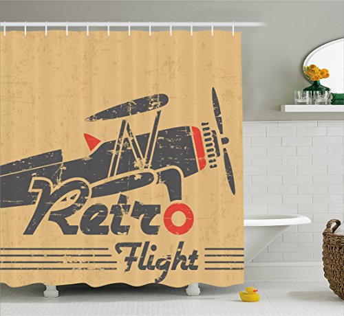 Vintage Airplane Shower Curtain by Ambesonne, Retro Flight Emblem with Old Plane Stripes Grunge Style, Fabric Bathroom Decor Set with Hooks, 70 Inches, Sand Brown Grey Vermilion
