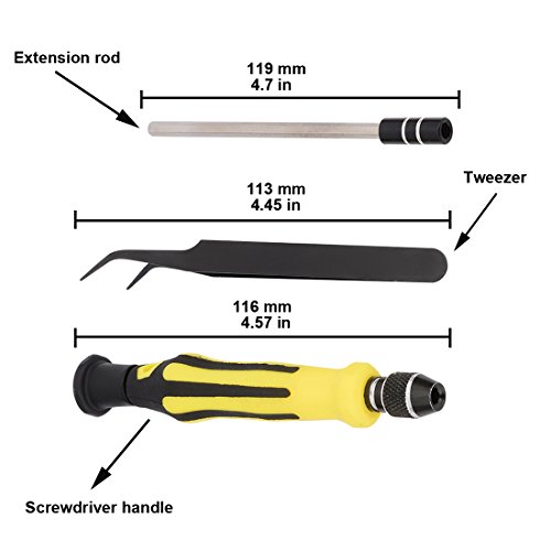 - Handy parts; comfortable non-slip ergonomic screwdriver handle puts your hand at ease; tweezer enable you to pick up small items easily and extension rod helps reaching into tight spot with less effort!