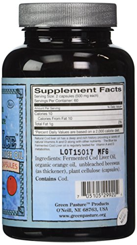 -. Binding : Health and Beauty -. Brand : Green Pasture -. Label : green pasture -. Manufacturer : green pasture -. PackageQuantity : 1 -. ProductGroup : Health and Beauty -. ProductTypeName : HEALTH_PERSONAL_CARE -. Publisher : green pasture -. Studio : green pasture -. Title : Blue Ice Fermented Cod Liver Oil Orange Flavor