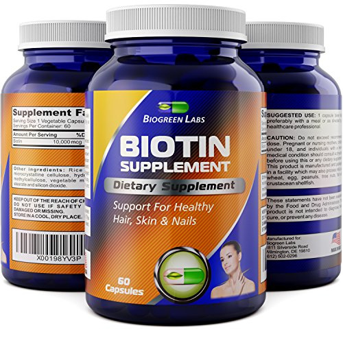 -. Feature : Natural hair loss supplement - Worried about your thinning hair? Better nutrition may help. Our Biotin Supplement gives you a generous daily dose of this important B Vitamin, nourishing your hair to promote healthy growth. / Vitamin for strengthening hair - Hair fall is P.R.Imarily caused by breakage. Do your locks snap at the slightest tug? Make your hair stronger with Biotin, a vitamin that strengthens and fortifies strands. It even makes hair more beautiful. / Promotes healthy digestion - Biotin isn't just good for your hair. It's also essential in digestion, since it helps in breaking down the carbs and fats you consume. Help your digestive system become more efficient with this vitamin. / Improves skin and nails - This vitamin helps your skin and nails too. Biotin makes nails stronger, while nourishing the skin to make it softer and healthier. This supplement is an excellent addition to your daily regimen. / American made - Our supplements are made by GMP certified laboratories, using the highest grade natural ingredients. Biogreen Labs is a brand that always puts customer satisfaction first. We want to be your first choice for dietary supplements.