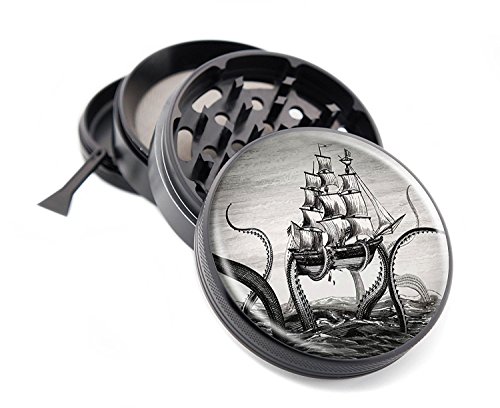 Kraken Attacks Pirate Ship 4 Piece Black Aluminum Metal Herb Grinder 3.0" 75mm Vintage Octopus Sea Creature Pirates Attack Boat Diamond Grind