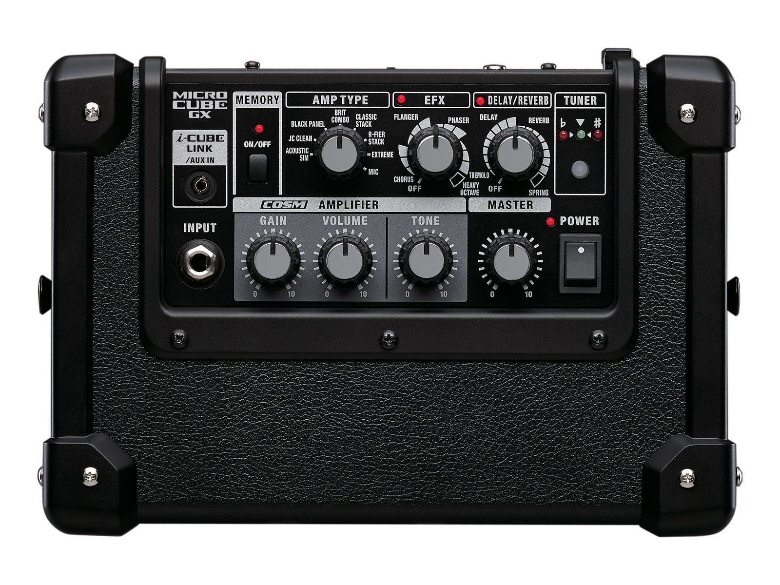 POWER switch, AMP TYPE switch (ACOUSTIC SIM, JC CLEAN, BLACK PANEL, BRIT COMBO, CLASSIC STACK, R-FIER STACK, EXTREME, MIC), MEMORY button, TUNER button, GAIN knob, VOLUME knob, TONE knob, EFX knob