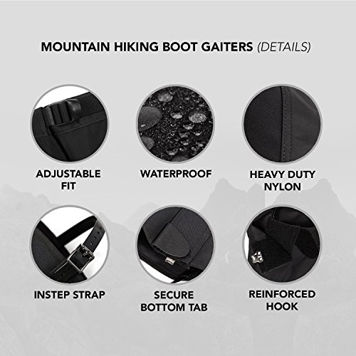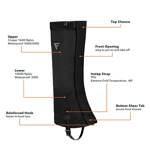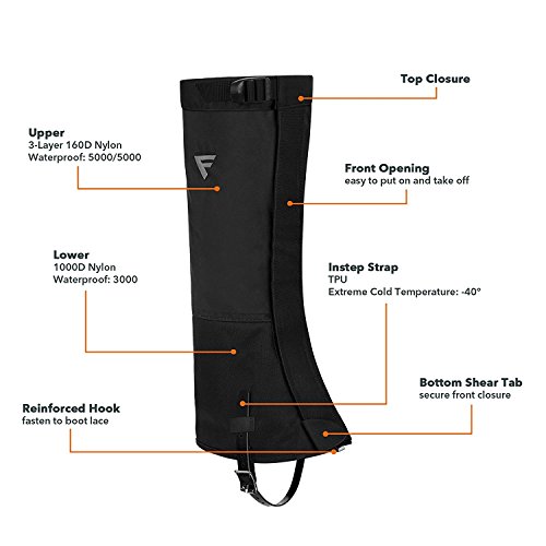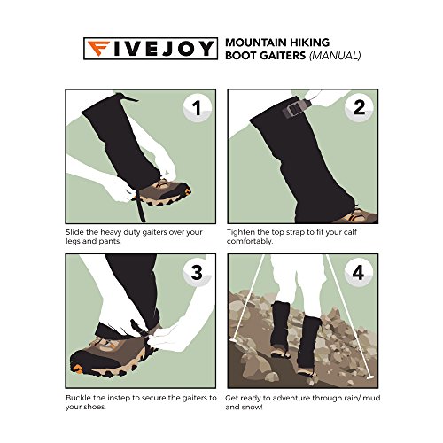 Don't let mud puddles and snowdrifts keep you from enjoying your backpacking trip! Click "Add to Cart" yellow button above and get it now Simple and lightweight, the FiveJoy Mountain Gaiters are the perfect choice for hikers, backpackers and cross-country skiers. - 160D durable scuff guards protect high-wear areas from abrasion - Tough fabric has durable water repellent and polyurethane coating to help shed moisture when you are stepping in puddles or hiking in the rain - Heavy-duty 1" hook-and-loop front closure provides a secure and adjustable fit - Shockcord and hook at the bottom ensure a snug fit around many types of footwear; shockcord at the top secure the gaiters around your calves - Rugged instep straps wrap underneath your shoes; buckle allows strap length adjustment. Specs: Upper Leg:160D Nylon, Waterproof/Breathable 5000/5000;Lower Leg: 1000D Nylon Lower Leg, Waterproof 3000mm; Instep Strap: TPU, Thickness 2mm 0 |