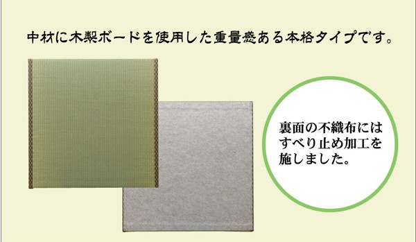 表地=い草(九州産) ※糸引織 中材=ウレタン3mm+木製ボード 裏地=すべり止め不織布 ヘリ=PP、PE