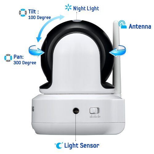 - Feature : 3.5" high quality color LCD display, secure and interference free 2.4Ghz signal, VGA(640x480) resolution / Remote control pan, tilt and zoom, remote controlled built-in night light to sooth little one to sleep, time display / 2-Way Talk Audio/Built-in Mic and Speaker, quiet mode to remove white background noise, expandable up to 4 cameras / Pure digital signal up to 900'(274m), Uses A/C power/rechargeable battery (only parent unit), monitor LEDs indicate 5 level of sound / Night vision allows for low light viewing up to 15ft, Non-visible IR LEDs, Low battery warning, Flip stand with belt clip