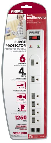 Prime Wire & Cable PB505106 6-Outlet 4+2 1250J with RJ11, Coax and 4-Foot Cord, White