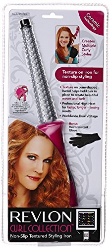 Revlon curl collection introduces the first non-slip textured curling wand iron. This curling wand comes with ceramic technology for high, even heat that penetrates hair from the inside out to retain moistures and reduces hot spots. The unique non-slip textured barrel creates loose curls, gorgeous spiral and bouncy waves. The textured curling and comes with professional high heat, tangle free swivel cord, world wide dual voltage and heat resistant glove.