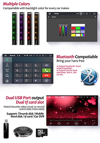 - Dual usb ports and tf card slots.Support headrest or monitor video output slaved. OTG supported -- car DVR recorder, USB drive,tf card 1080P video playing.Support external microphone, reversing camera input, ODBII, steering wheel control