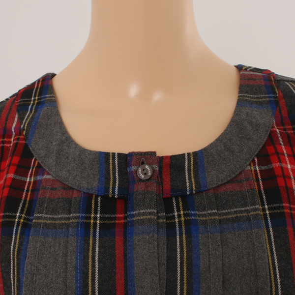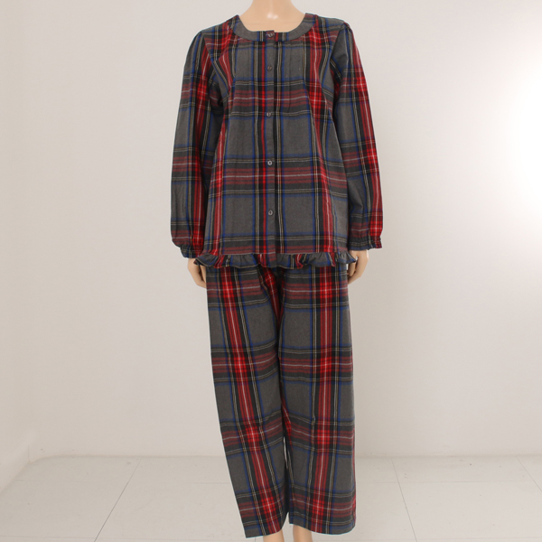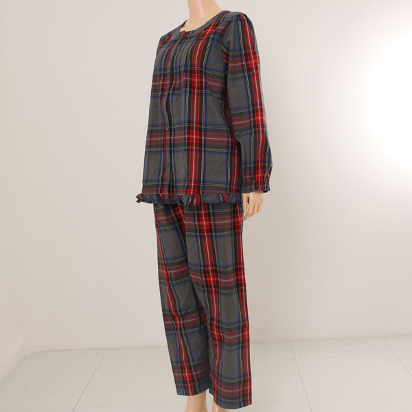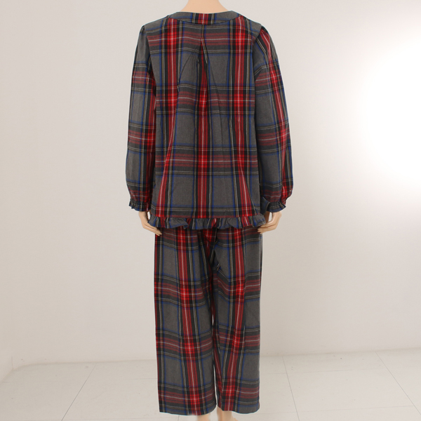 회색 멜란지 원단에 레드포인트로 와코루만의 체크 칼라감의 패턴이 고급스러우면서 세련된 여성 잠옷