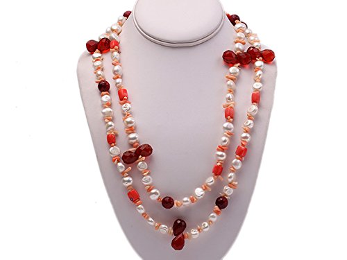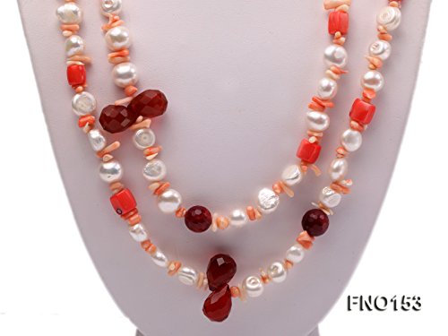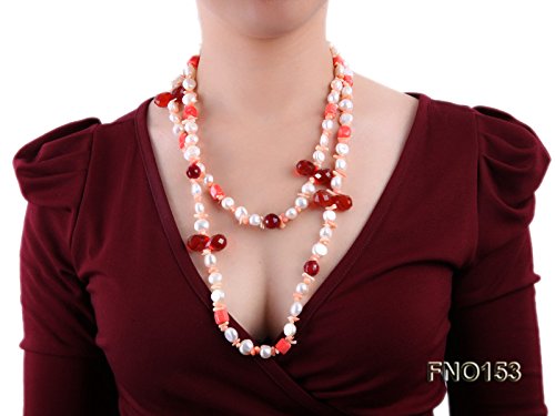 Description *Fashionable necklace is made up of 11-12mm freshwater pearl and alternated with crystal and coral beads. Its length is 55 inches.